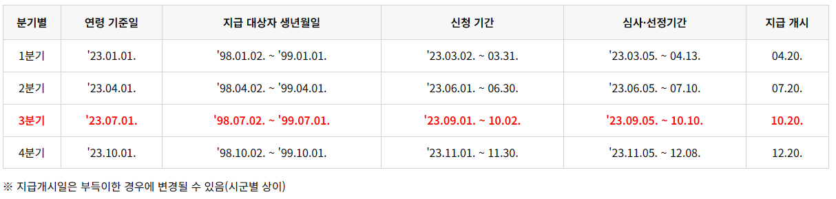 2023년 7월 1일 기준으로 만 24세의 청년 중 22년 4분기부터 23년 1,2분기까지 미신청 청년은 추가 신청 시면 소급 적용이 간능합니다. 단 추가 신청 시 거주지 기준 조건이 지급기준에 부합하여야 합니다.