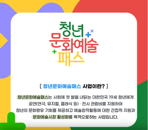 청년에게 문화 예술 공연 관람으로 휴식과 정서적 안정을 제공하고, 침체되어 있는 문화예술시장을 활성화하기 위한 사업으로 올해 처음 시행되는 사업입니다. 청년문화예술패스 지원 사업은 대한민국의 2005년생 청년 누구나 지원을 받을 수 있습니다.